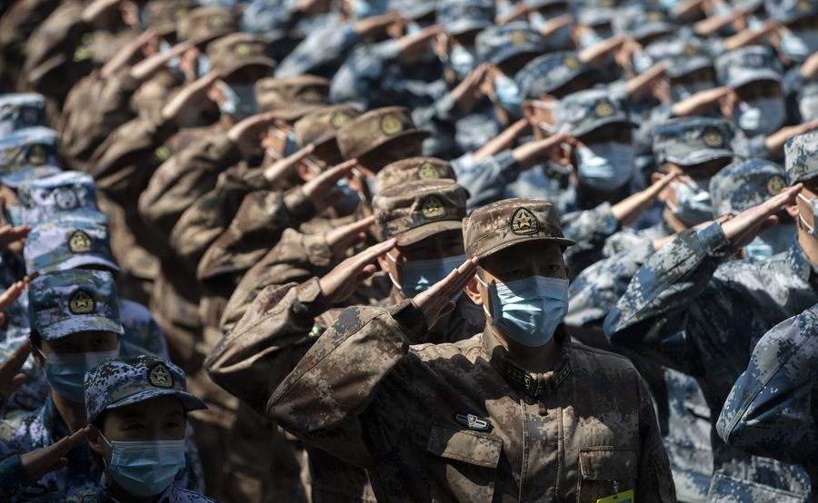 Military medics salute to the Huoshenshan Hospital in Wuhan, central China's Hubei Province, April 15, 2020. (Xinhua/Fei Maohua)