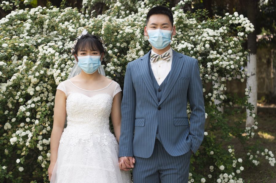 Wang Kun and his wife Yuan Yifeng pose for wedding photos delayed by the COVID-19 outbreak as the epidemic situation is steadily moving in a positive direction in Xiangyang City, central China's Hubei Province, April 7, 2020. (Xinhua/Xie Jianfei)