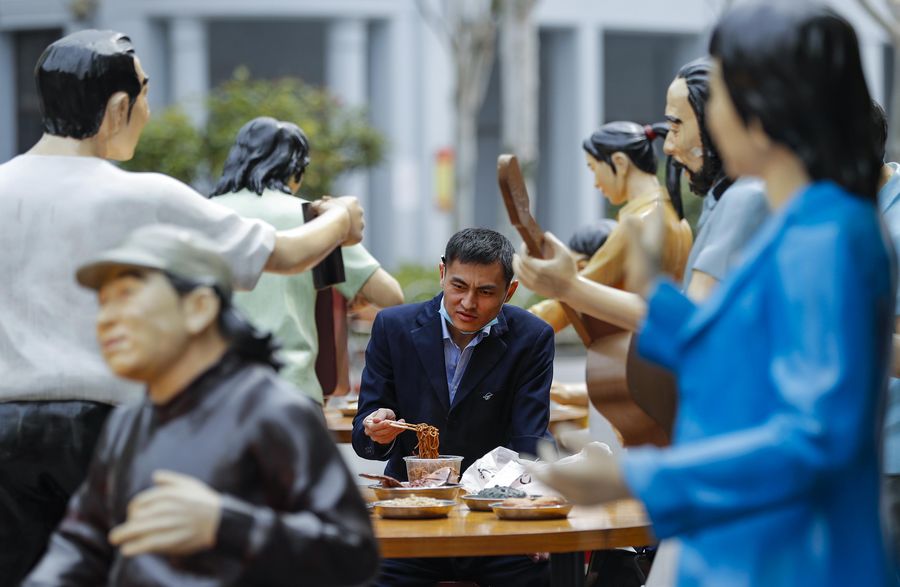 A man has a meal beside statues at an outdoor restaurant in Wuhan, central China's Hubei Province, April 5, 2020. (Xinhua/Shen Bohan)