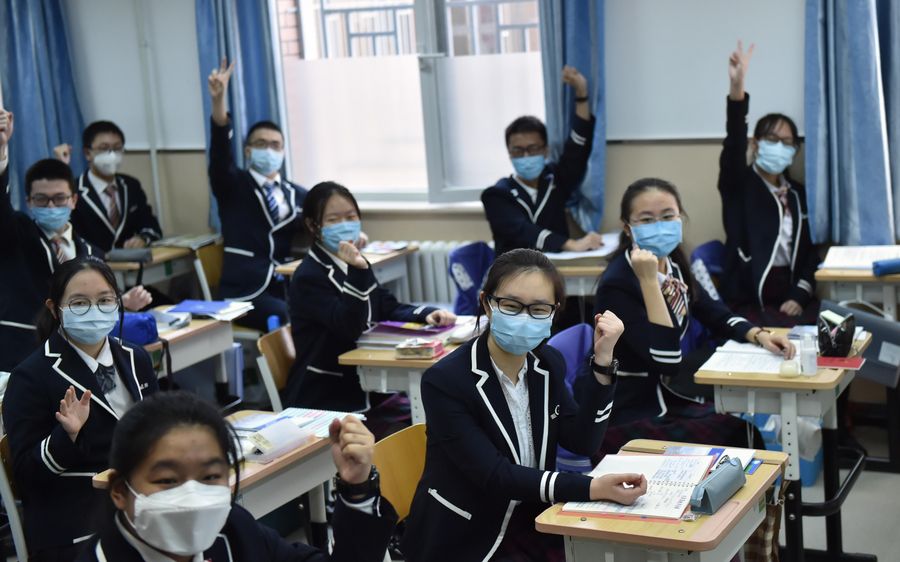 Nearly 50,000 senior students of high schools in Beijing returned to campus to start their postponed new semester on April 27 as the COVID-19 epidemic situation has been eased. (Xinhua/Chen Zhonghao)