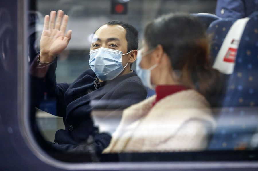 A man on board train G431 from Wuhan to Nanning of south China's Guangxi Zhuang Autonomous Region, the first outbound train leaving Hubei Province from Wuhan since the outbound travel restrictions were lifted, waves his hand outwards at the Wuhan Railway Station in Wuhan, capital of central China's Hubei Province, April 8, 2020. (Xinhua/Shen Bohan)