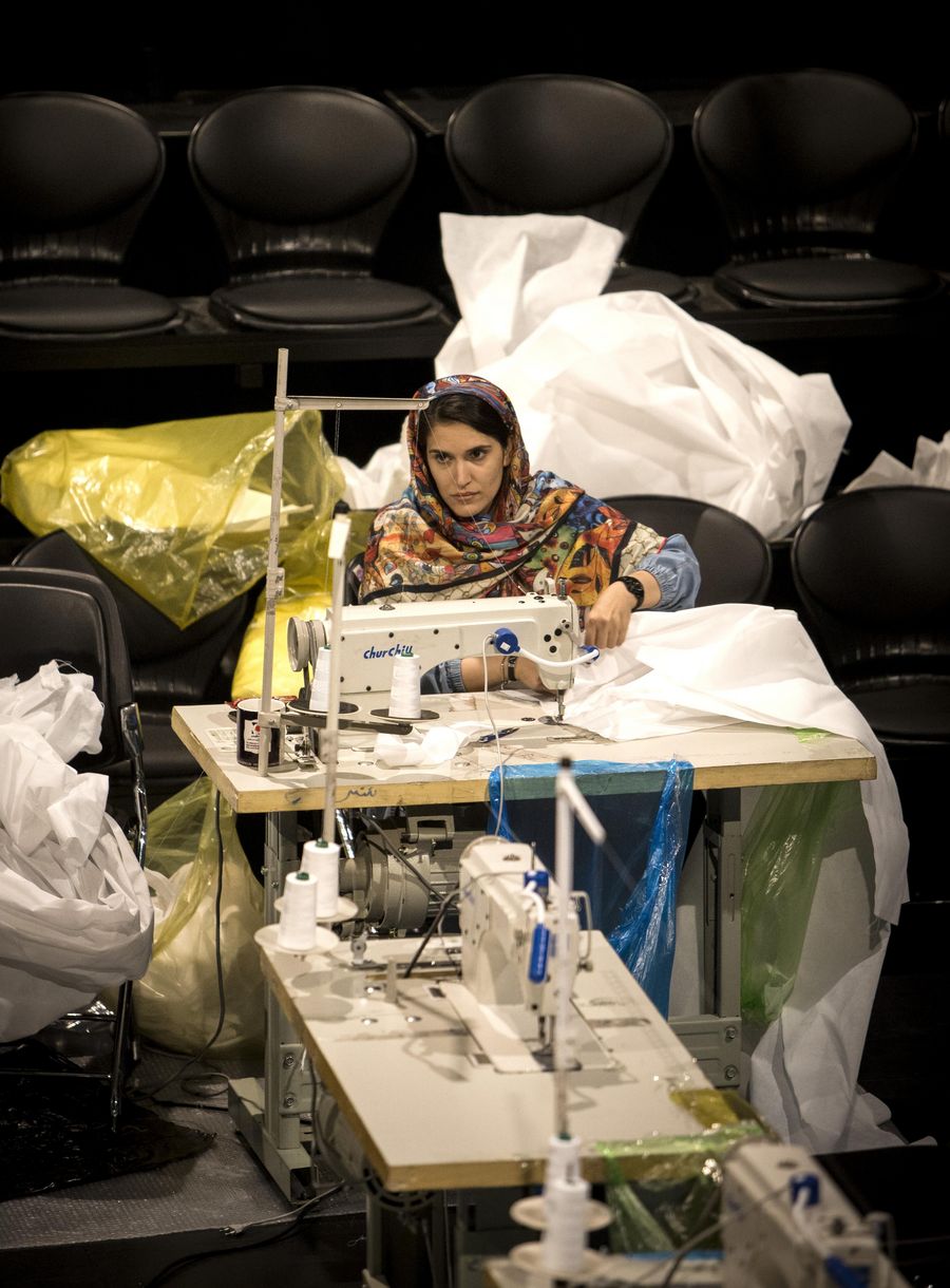 A volunteer makes face masks at the Hafez theater hall in Tehran, Iran, April 21, 2020. (Photo by Ahmad Halabisaz/Xinhua)