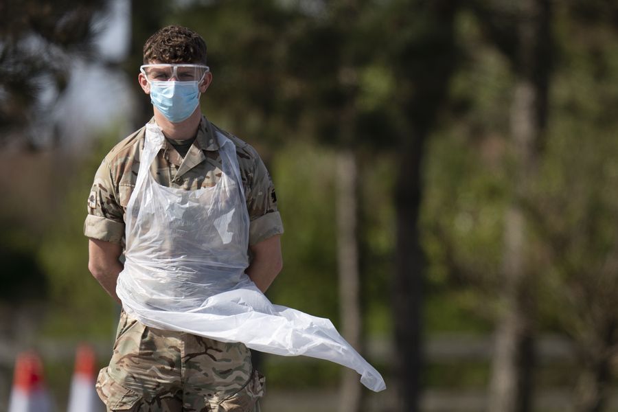 A serviceman works at a drive-through COVID-19 testing facility in Southport, Britain, April 23, 2020. (Photo by Jon Super/Xinhua)