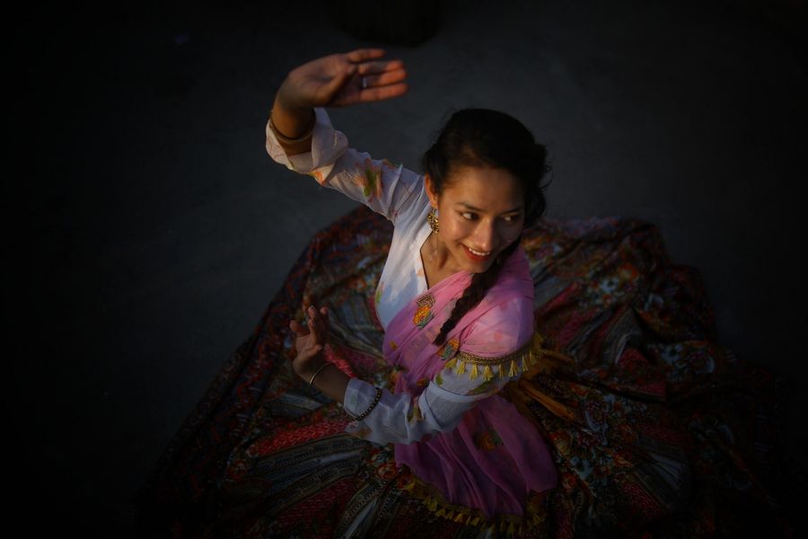 Dance teacher Shristi Maharjan, 18, practices on the roof terrace of her house during the lockdown imposed by the government amid concern of COVID-19 in Kathmandu, Nepal, April 4, 2020. (Photo by Sulav Shrestha/Xinhua)