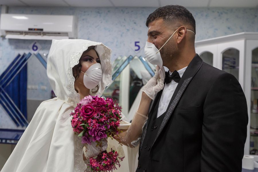 Palestinian bride Shima' al-Titi adjusts the face mask for her groom, Ishaq Musleh, before they leave the beauty salon in the Palestinian Deheisheh refugee camp near the West Bank city of Bethlehem, April 10, 2020. (Photo by Luay Sababa/Xinhua)