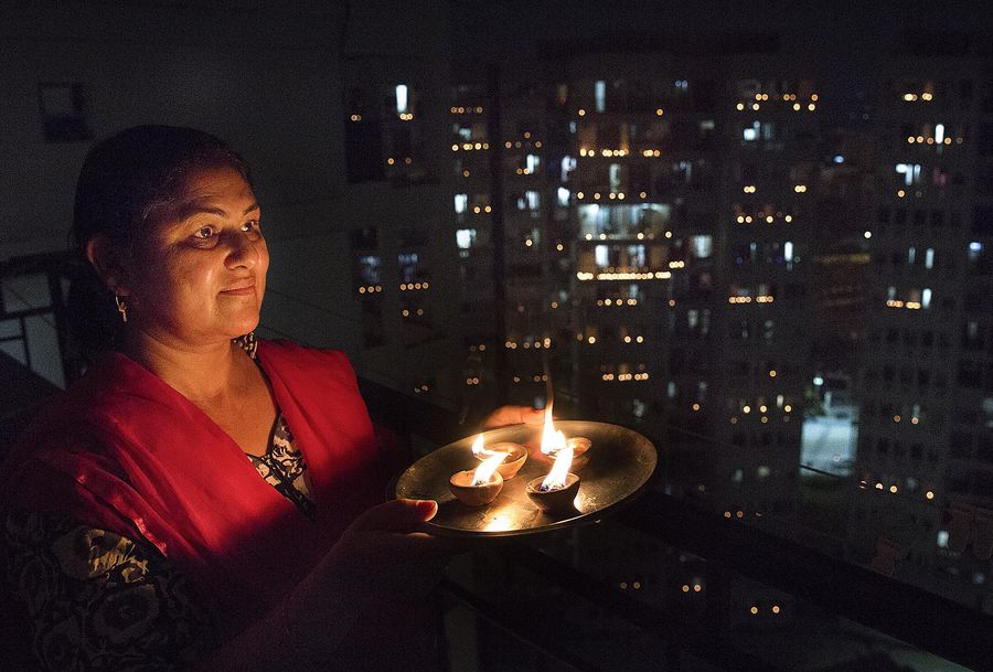 An Indian woman lights earthen lamps on her balcony to mark the country's fight against the COVID-19 pandemic in New Delhi, India, April 5, 2020. (Xinhua/Javed Dar)