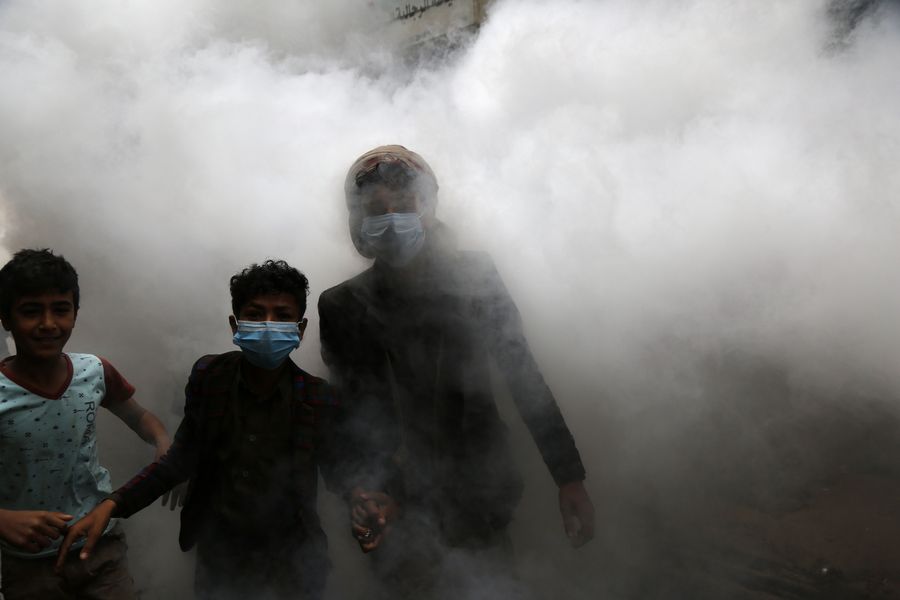 People walk through fumigation on a street in Sanaa, Yemen, April 30, 2020. (Photo by Mohammed Mohammed/Xinhua)