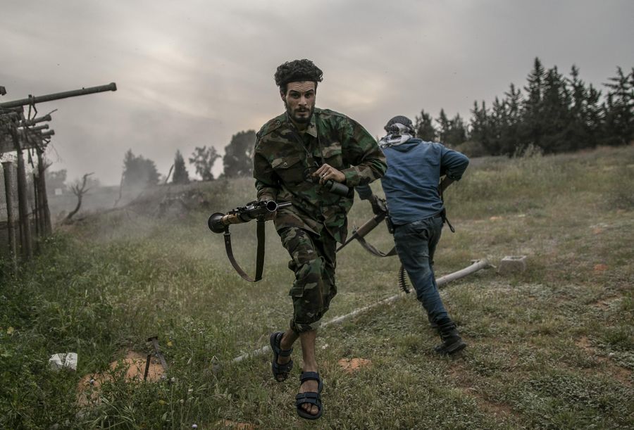 Fighters of UN-backed Government of National Accord (GNA) run to take cover during clashes with Libyan National Army (LNA) at Ain-Zara front line in Tripoli, Libya, April 2, 2020. (Photo by Amru Salahuddien/Xinhua)