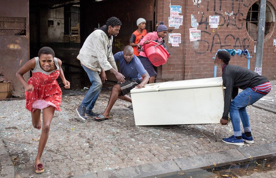 People run out of a building when a fire breaks out in Johannesburg, South Africa, April 16, 2020. (Photo by Yeshiel/Xinhua)