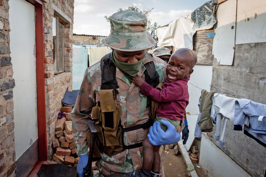 A soldier of South African National Defense Force carries a baby in his arm in Johannesburg, South Africa, April 20, 2020. (Photo by Yeshiel/Xinhua)