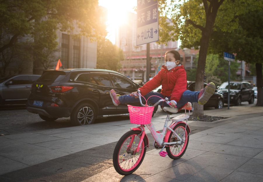 A child rides a bike on a street in Wuhan, central China's Hubei Province, April 12, 2020. (Xinhua/Xiao Yijiu)