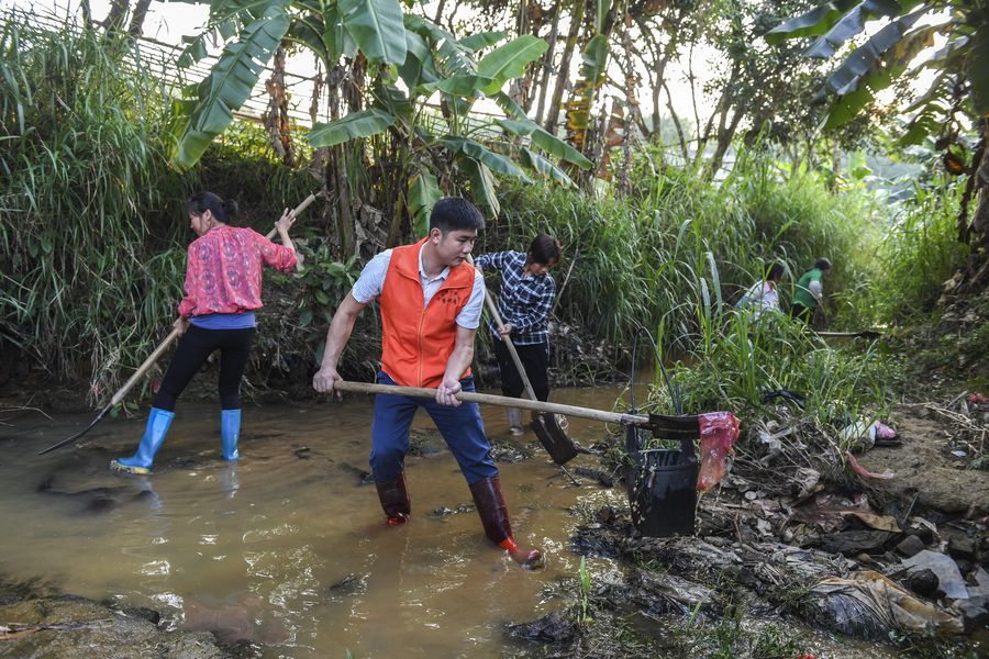 Dong Jiyou (2nd L), a 31-year-old village official of Jinhua Village, helps villagers clean a river in Xiaopingshan Township of Xingye County, south China's Guangxi Zhuang Autonomous Region, May 2, 2020. (Xinhua/Cao Yiming)