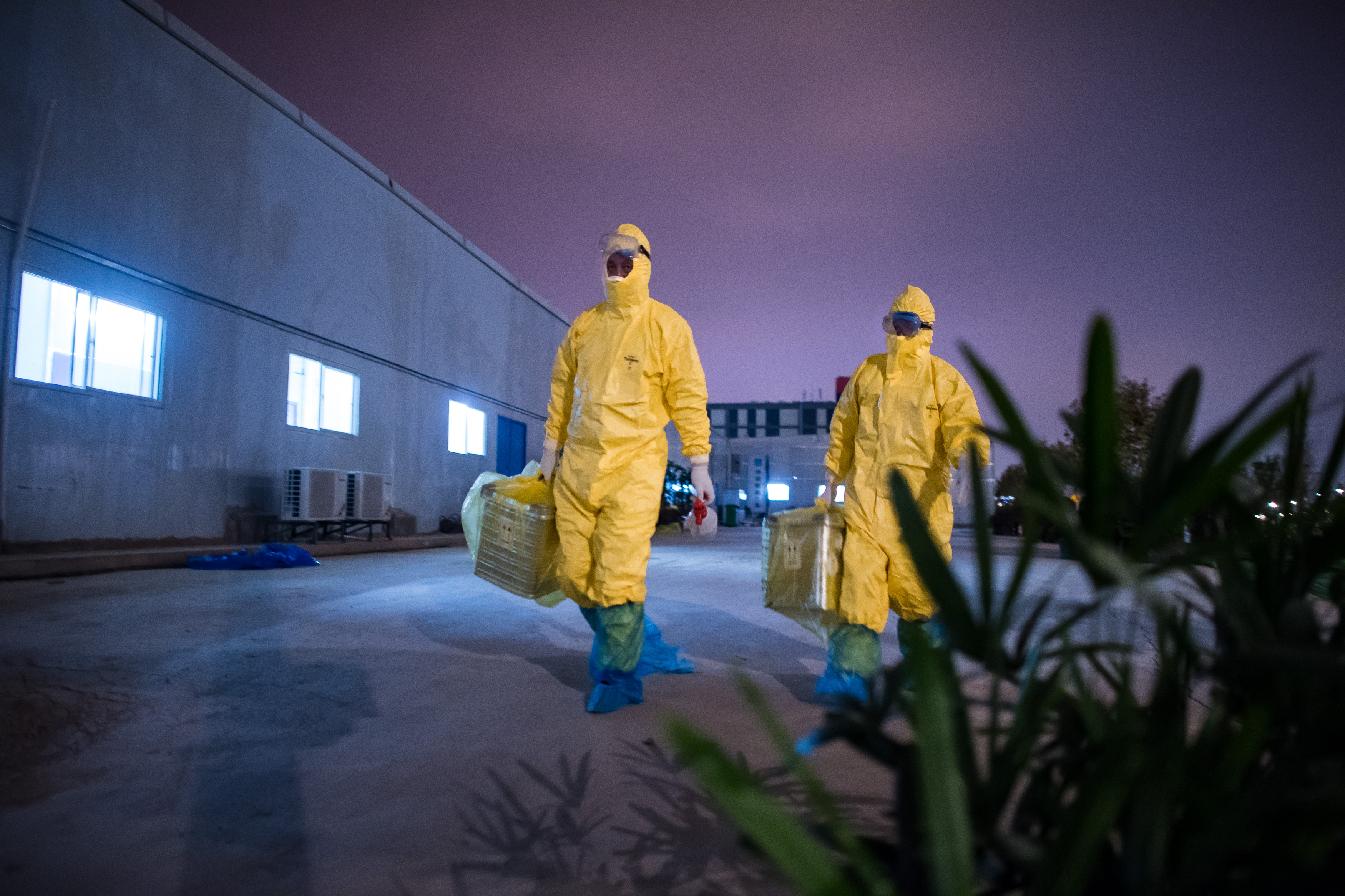 Liu Senbo (L) and his colleague Mei Yiqi carry sealed boxes containing samples collected from patients at the Leishenshan (Thunder God Mountain) Hospital in Wuhan, central China's Hubei Province, Feb. 24, 2020. (Xinhua/Xiao Yijiu)