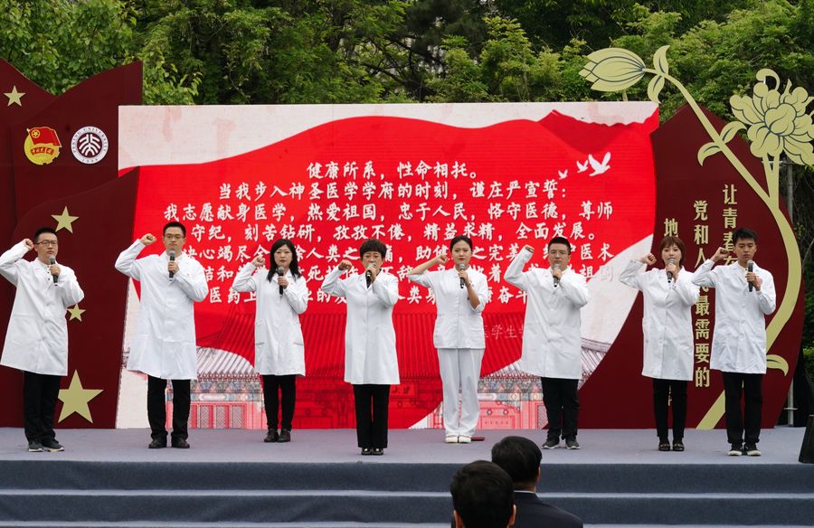 Youth representatives who were on a medical team dispatched to Hubei Province during the COVID-19 pandemic attend a poem recital event held to mark the Chinese Youth Day at Peking University in Beijing, capital of China, May 4, 2020. (Xinhua/Zhang Chenlin)