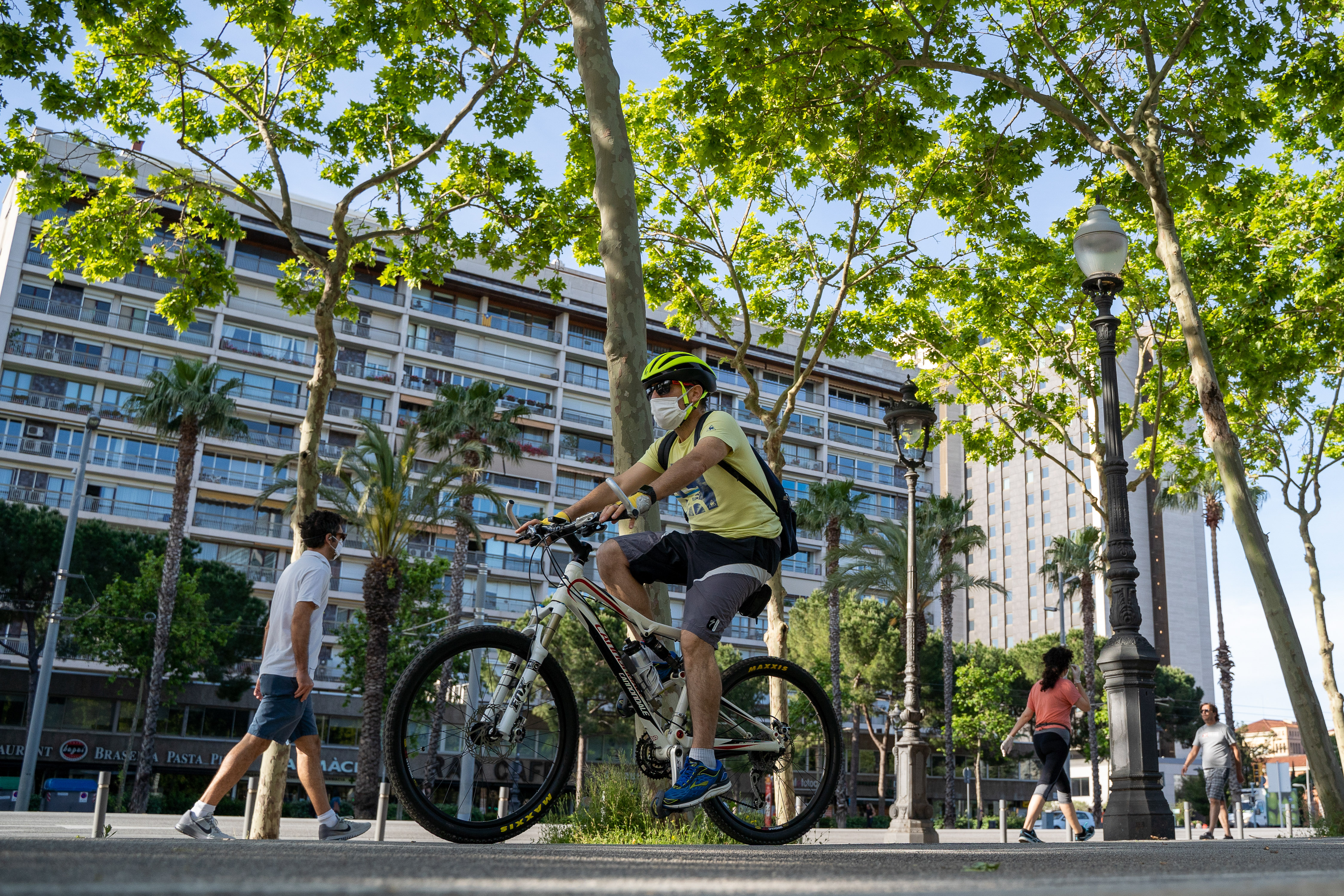 People do exercises at the Diagonal Avenue in Barcelona, Spain, May 2, 2020. (Photo by Joan Gosa/Xinhua)