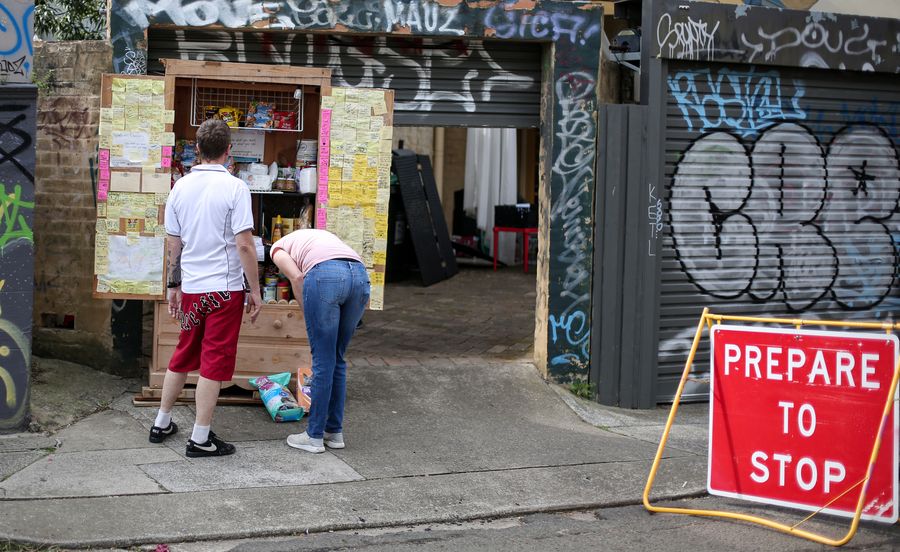Residents check the Newtown Blessing Box in the community of Newtown in Sydney, Australia, April 29, 2020. (Xinhua/Bai Xuefei)
