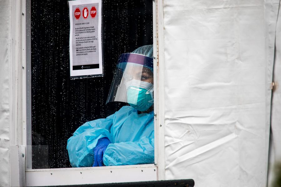 A healthcare worker looks out of the window of a tent in front of Brooklyn Hospital Center in the Brooklyn borough of New York, the United States, on April 24, 2020. (Photo by Michael Nagle/Xinhua)