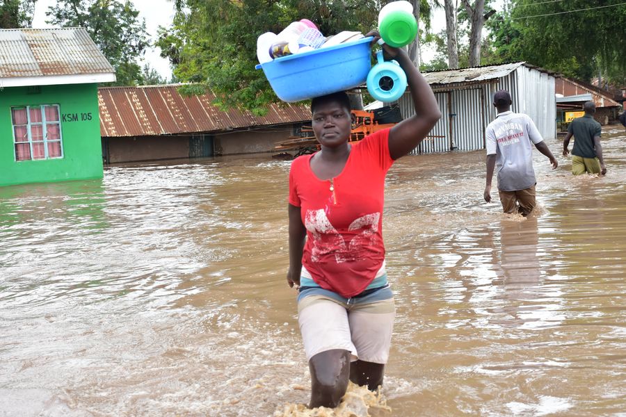 A woman salvages her belongings after River Nyando broke its banks in Kisumu, Kenya, April 21, 2020. (Xinhua/Fred Mutune)
