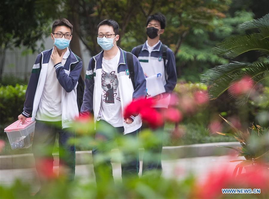 Senior students walk into Wuhan No. 6 High School in Wuhan, central China's Hubei Province, May 6, 2020. Senior students in 121 high and vocational schools returned to campus on Wednesday in Wuhan City. These schools have carried out cleaning and preventive disinfection before opening. Health tests are required for all faculty and staff of Grade Three classes in these schools and for students prior to their return. (Xinhua/Xiao Yijiu)