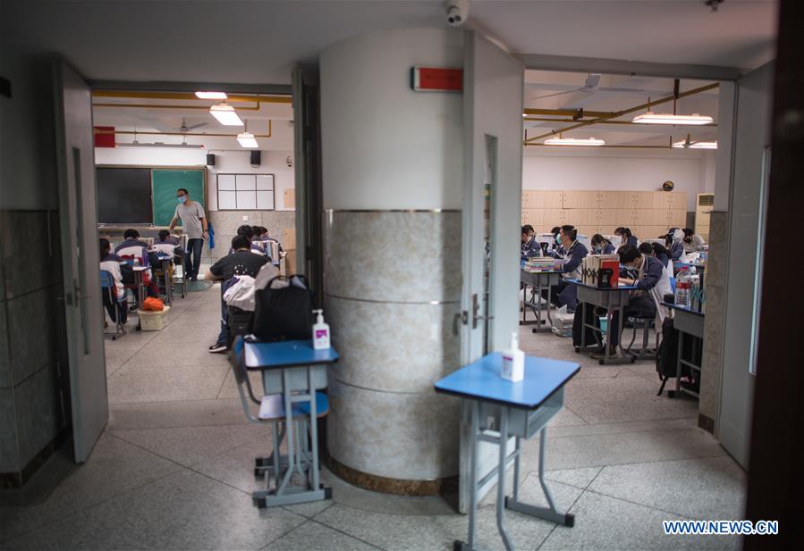 A class is divided into two parts with less than 30 students of each class at Wuhan No. 6 High School in Wuhan, central China's Hubei Province, May 6, 2020. Senior students in 121 high and vocational schools returned to campus on Wednesday in Wuhan City. These schools have carried out cleaning and preventive disinfection before opening. Health tests are required for all faculty and staff of Grade Three classes in these schools and for students prior to their return. (Xinhua/Xiao Yijiu)