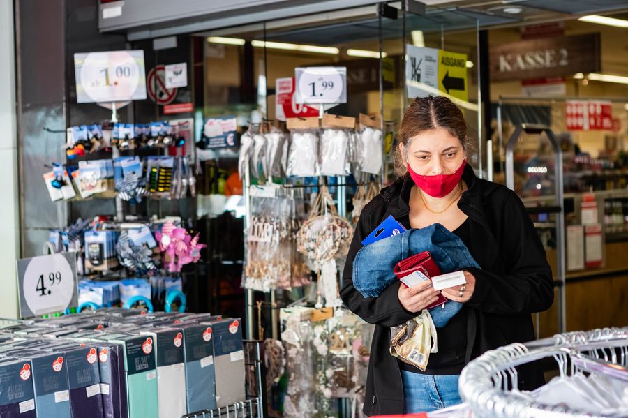 A woman wearing a face mask leaves a shop in Berlin, capital of Germany, on April 29, 2020. (Photo by Binh Truong/Xinhua)