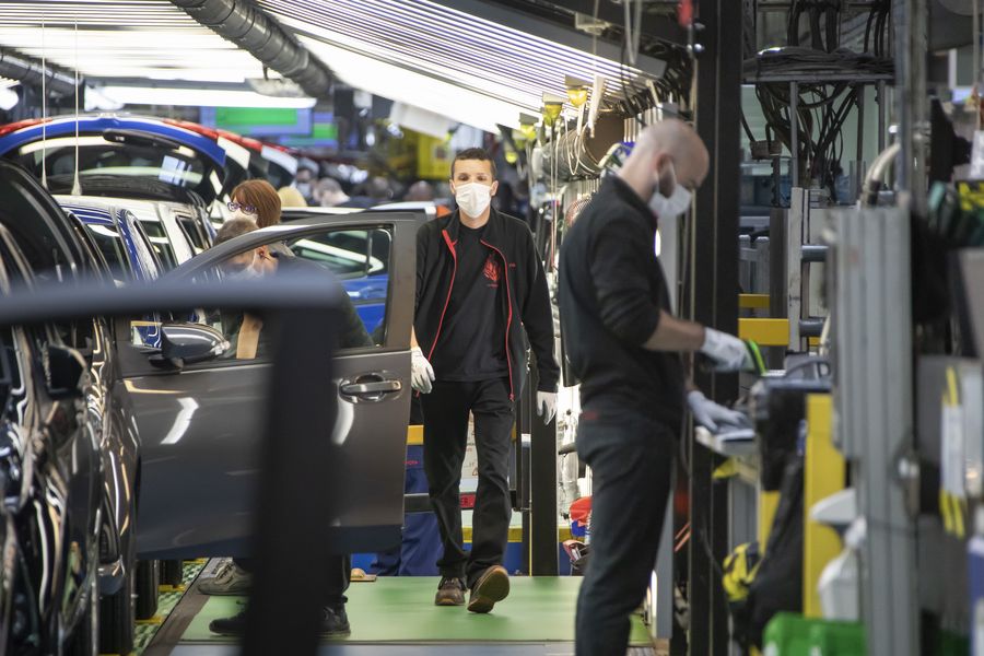 Workers wearing face masks work in Toyota factory in Valenciennes, France, April 28, 2020. (Xinhua)■