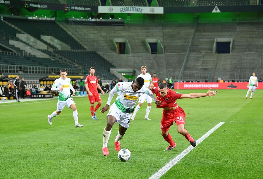 Breel Embolo (Front, L) of Monchengladbach vies with Ellyes Skhiri of Cologne during a German Bundesliga match held behind closed doors due to the COVID-19 outbreak on March 11, 2020. (Xinhua/Ulrich Hufnagel)