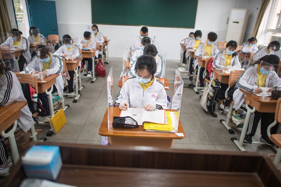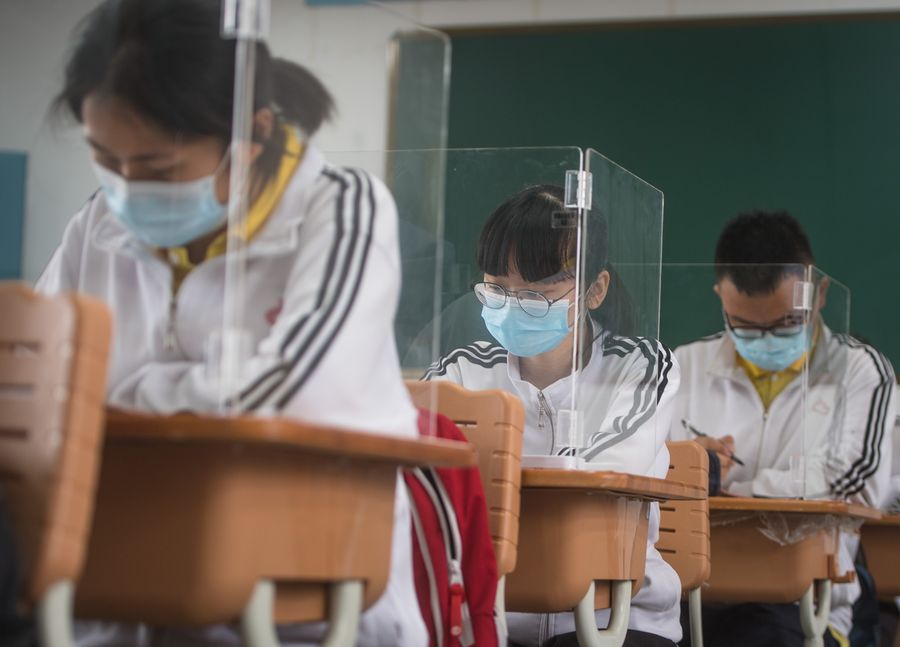 Senior students study in a classroom with transparent boards placed on each desk to separate each other as a precautionary measure against the spread of COVID-19 at Wuhan No. 23 Middle School in Wuhan, central China's Hubei Province, May 6, 2020. (Xinhua/Xiao Yijiu)