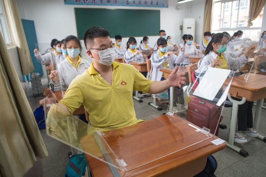 Senior students open transparent boards to place them on the desks to separate from each other as a precautionary measure against the spread of COVID-19 in a classroom at Wuhan No. 23 Middle School in Wuhan, central China's Hubei Province, May 6, 2020. (Xinhua/Xiao Yijiu)