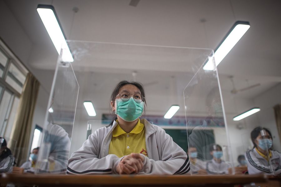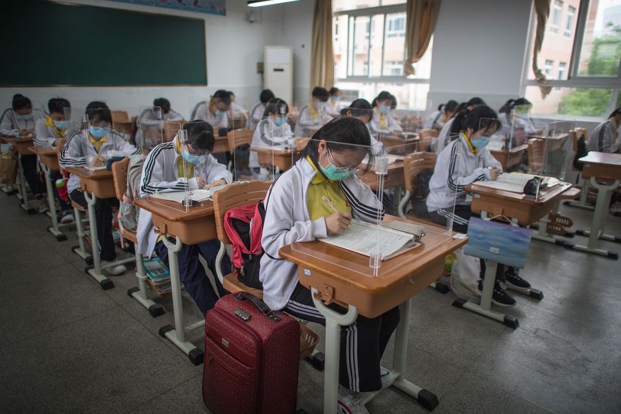 Senior students have a class in a classroom with transparent boards placed on each desk to separate each other as a precautionary measure against the spread of COVID-19 at Wuhan No. 23 Middle School in Wuhan, central China's Hubei Province, May 6, 2020. (Xinhua/Xiao Yijiu)