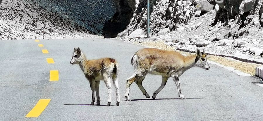 Mobile photo taken on May 3, 2020 shows two blue sheep on a road to Mount Qomolangma at the Mount Qomolangma National Nature Reserve in southwest China's Tibet Autonomous Region. (Xinhua/Shen Hongbing)