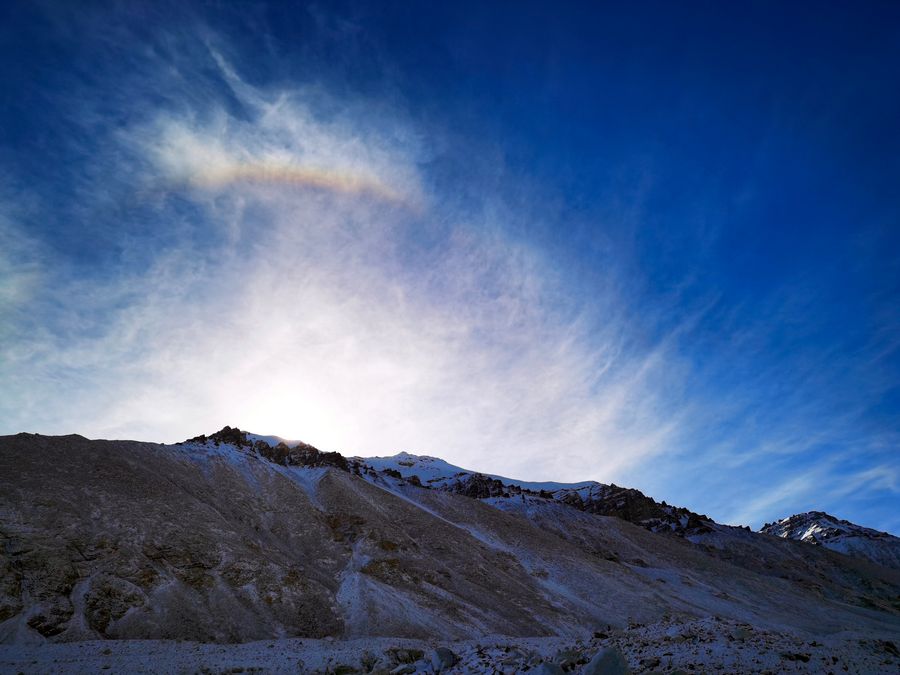 Mobile photo taken on May 3, 2020 shows a rainbow over the base camp of Mount Qomolangma in southwest China's Tibet Autonomous Region. (Xinhua/Shen Hongbing)