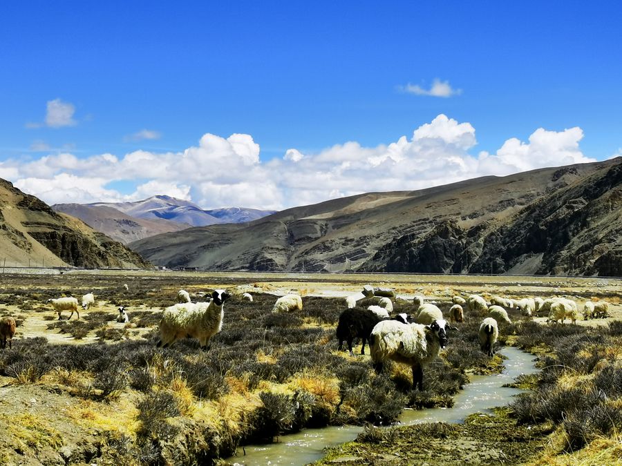 Mobile photo taken on May 3, 2020 shows a herd of sheep at the Mount Qomolangma National Nature Reserve in southwest China's Tibet Autonomous Region. (Xinhua/Shen Hongbing)
