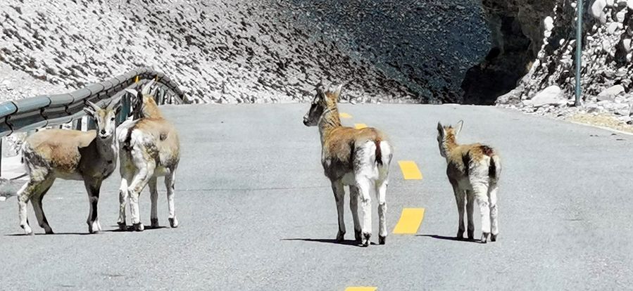 Mobile photo taken on May 3, 2020 shows blue sheep on a road to Mount Qomolangma at the Mount Qomolangma National Nature Reserve in southwest China's Tibet Autonomous Region. (Xinhua/Shen Hongbing)■