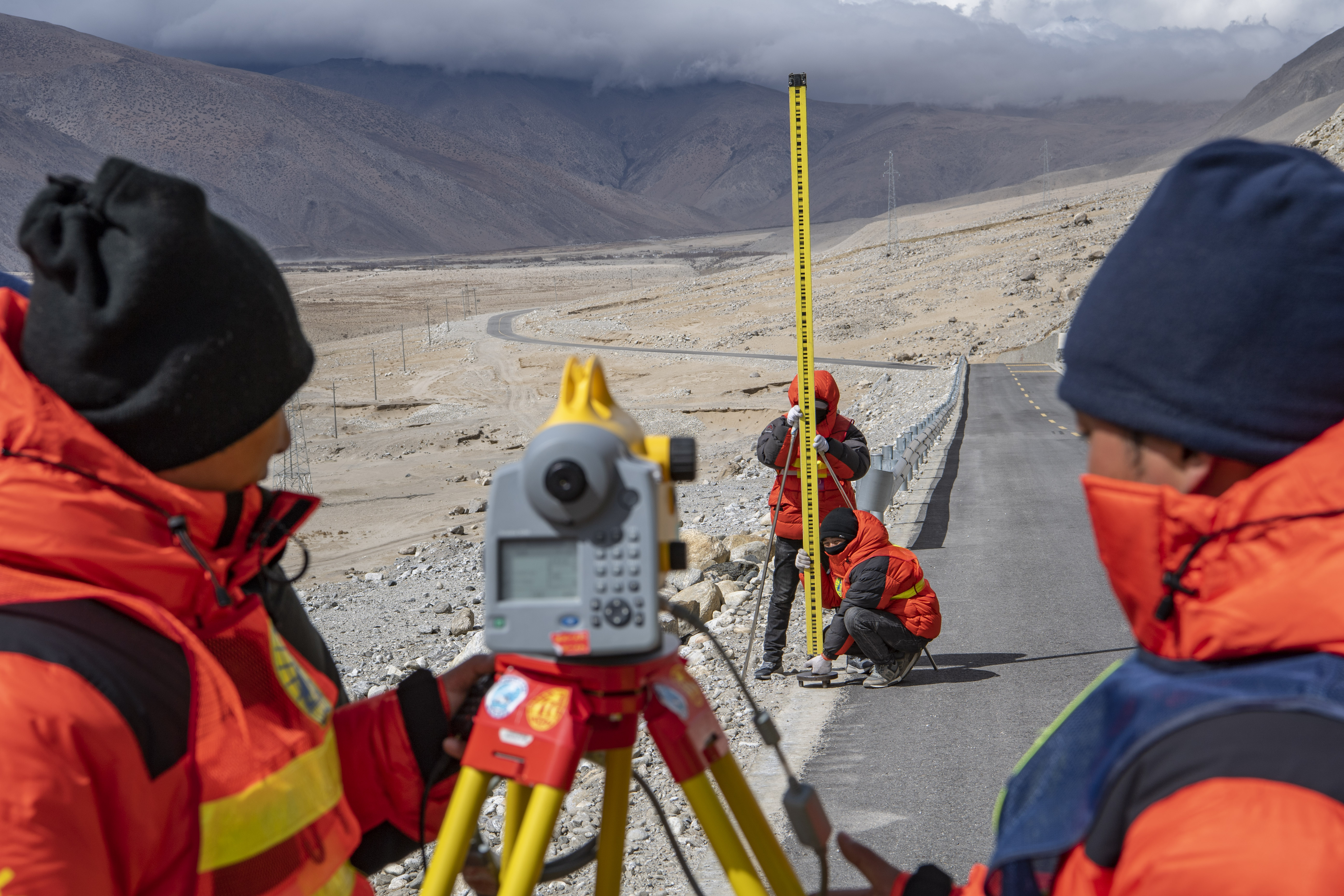 Measurement team members conduct leveling at Tingri County, southwest China's Tibet Autonomous Region, April 18, 2020. (Xinhua/Sun Fei)