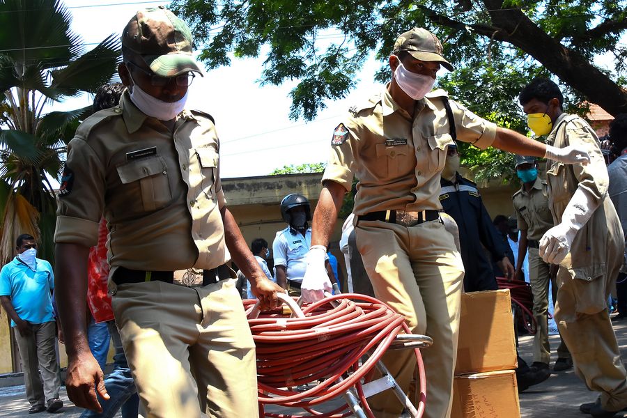 Police personnel carry oxygen pipes after a gas leakage at the "LG Polymers" chemical plant in the Vishakhapatnam district of Andhra Pradesh, India, May 7, 2020. (Str/Xinhua)