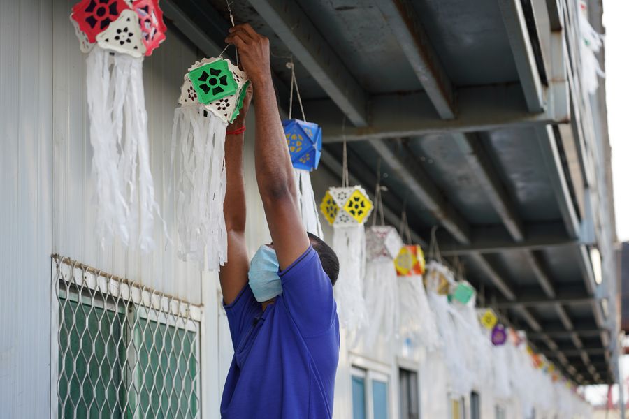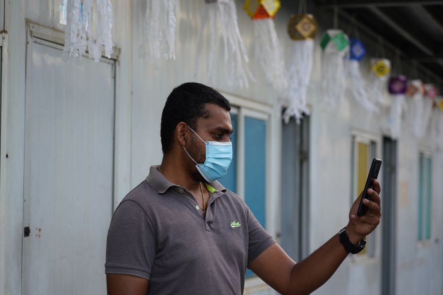 A local employee video calls his family on Vesak festival in Colombo Port City, Sri Lanka, May 7, 2020. (Photo by Peng Bo/Xinhua)