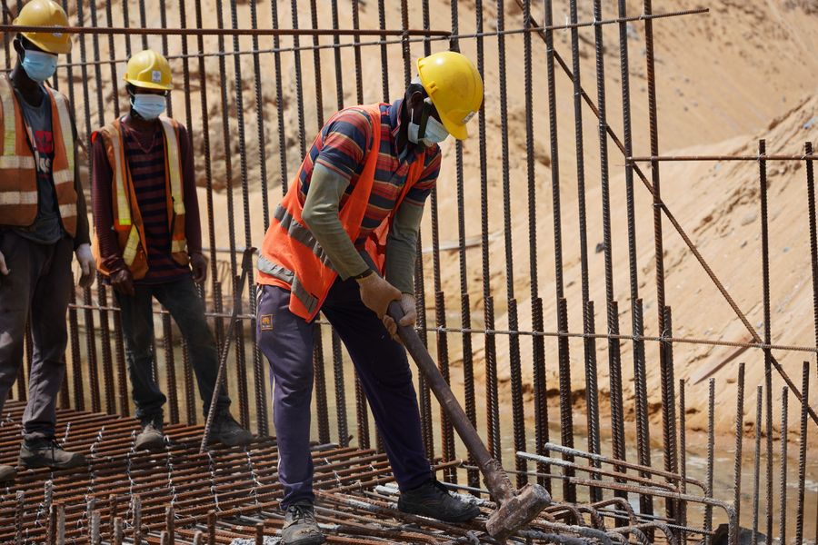 Employees work at the construction site in Colombo Port City, Sri Lanka, May 7, 2020. (Photo by Peng Bo/Xinhua)