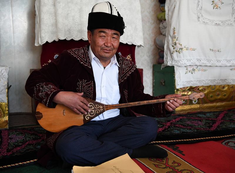 Jarhnu Wuhas performs at his home in Xinyuan County under Ili Kazakh Autonomous Prefecture, northwest China's Xinjiang Uygur Autonomous Region, April 19, 2020. (Xinhua/Song Yanhua)