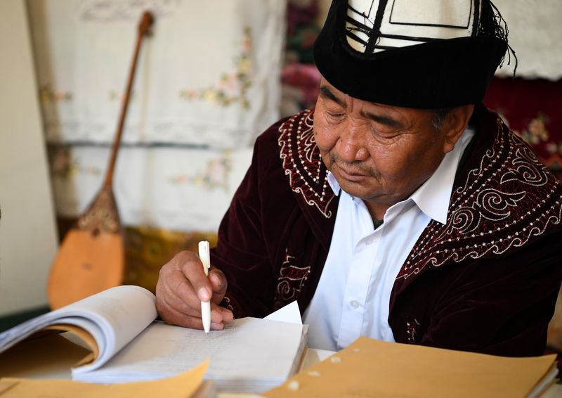 Jarhnu Wuhas works on lyrics at his home in Xinyuan County under Ili Kazakh Autonomous Prefecture, northwest China's Xinjiang Uygur Autonomous Region, April 19, 2020. (Xinhua/Song Yanhua)