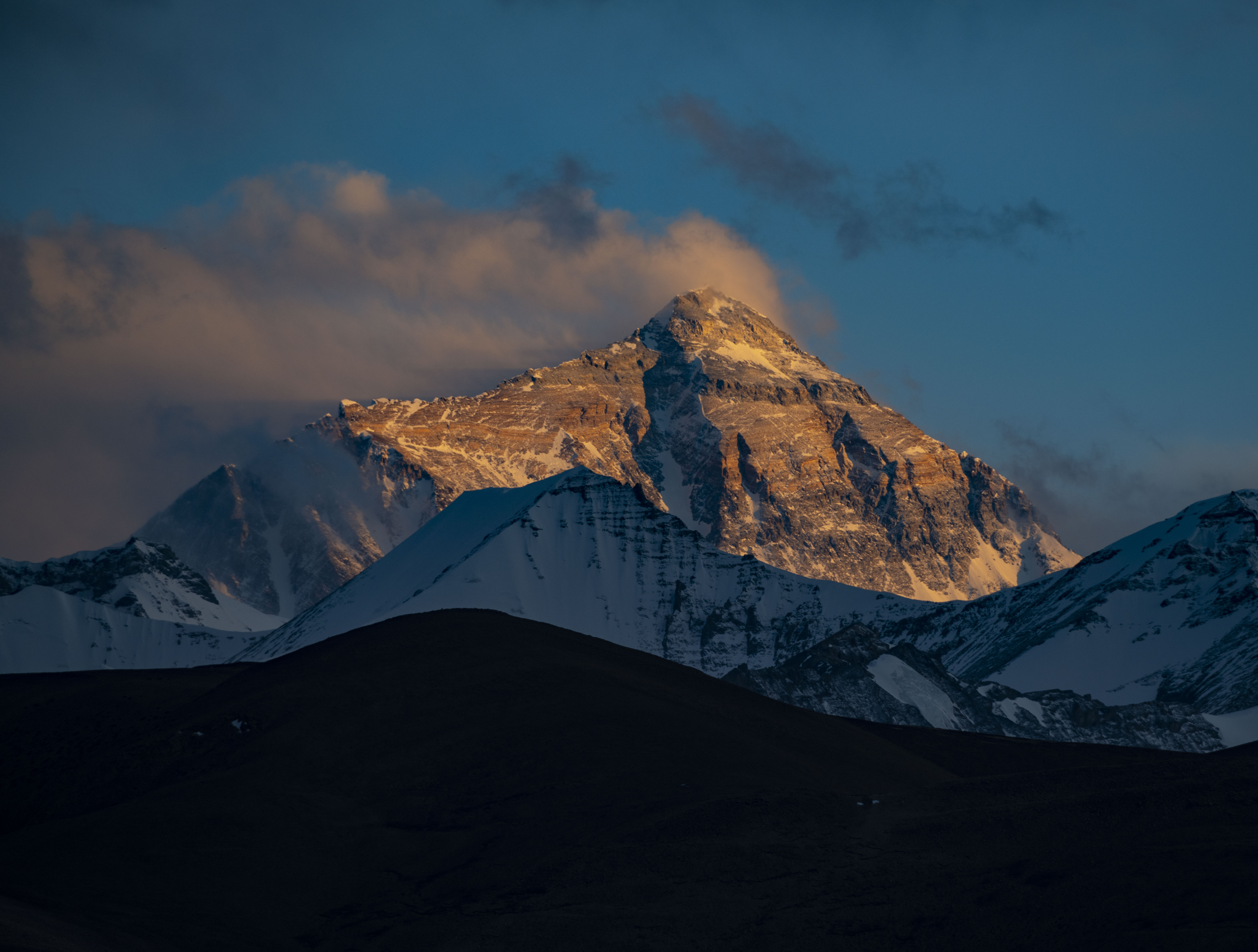 Photo taken on May 3, 2020 shows the scenery of Mount Qomolangma at sunset in southwest China's Tibet Autonomous Region. (Xinhua/Purbu Zhaxi)