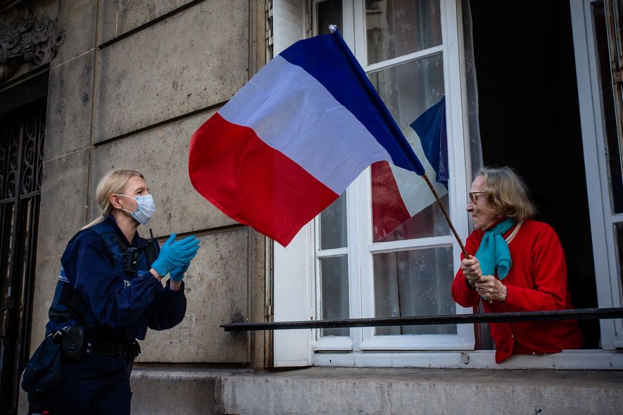 A police officer interacts with a woman waving a French flag on a residential building in Saint-Mande, near Paris, France, on May 2, 2020. (Photo by Aurelien Morissard/Xinhua)
