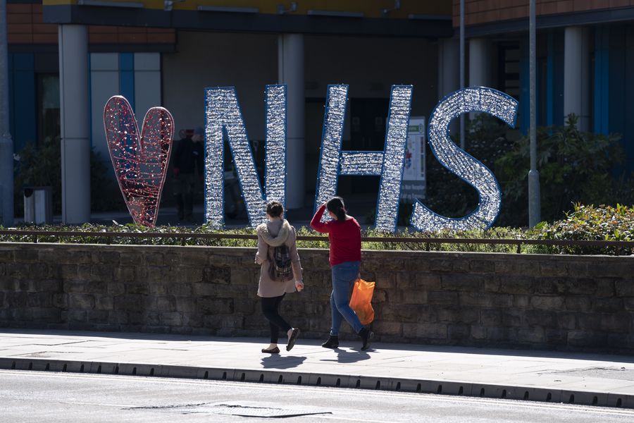 People walk past a Love NHS (National Health Service) sign outside Salford Royal Hospital in Manchester, Britain, on May 5, 2020. (Photo by Jon Super/Xinhua)