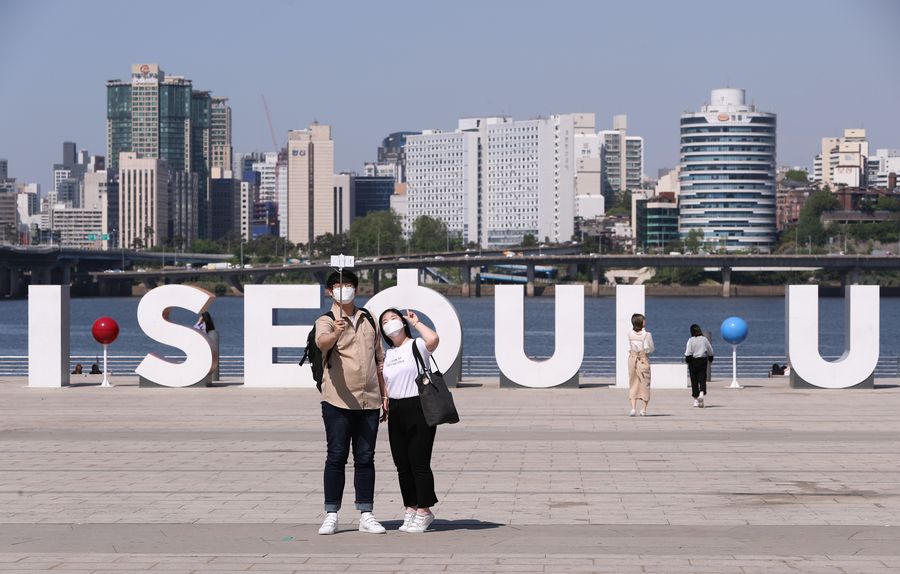 People take selfies at Yeouido Hangang Park in Seoul, South Korea, May 6, 2020. (Xinhua/Wang Jingqiang)
