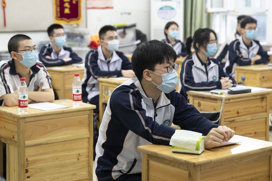 Senior students attend a class in Hubei Wuchang Experimental High School in Wuhan, central China's Hubei Province, May 6, 2020. Senior students in 121 high and vocational schools returned to campus on Wednesday in Wuhan City. (Xinhua/Xiong Qi)