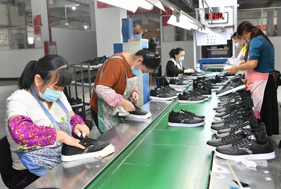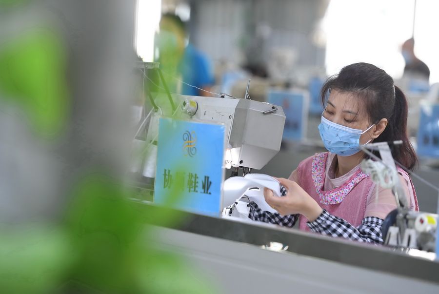 A woman works in a workshop of Hsieh Shun Footwear Co., Ltd. in Putian, southeast China's Fujian Province, May 7, 2020. (Xinhua/Lin Shanchuan)