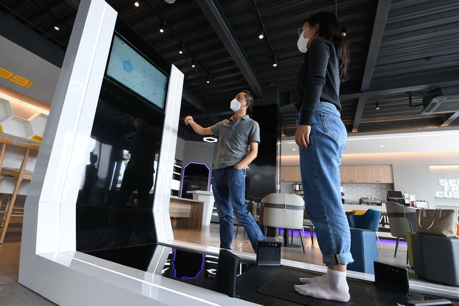 A customer has her feet measured on a smart device in sports footwear manufacturer SEMS in Putian, southeast China's Fujian Province, May 8, 2020. (Xinhua/Lin Shanchuan)