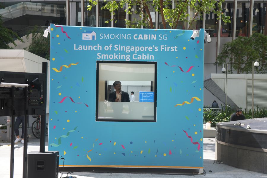 A man smokes inside a smoking cabin in Singapore on May 21, 2019. The air-conditioned cabin measuring 4.8 square metres in size allows a maximum of 10 users at one time, and uses 3 filters to filter the air inside. (Xinhua/Then Chih Wey)