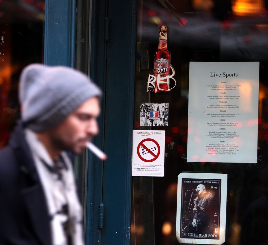 A man walks past a bar with anti-smoking poster on the door in Paris, capital of France, Jan. 8, 2011. (Xinhua/Gao Jing)■