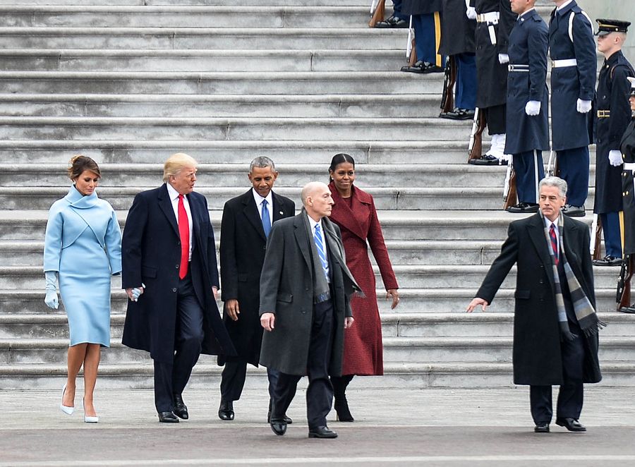 Photo taken on Jan. 20, 2017, shows former U.S. President Barack Obama and his wife Michelle Obama walking to the helicopter escorted by newly-inaugurated U.S. President Donald Trump and his wife Melania Trump after Donald Trump was sworn in as the 45th President of the United States in Washington D.C., the United States. (Xinhua/Bao Dandan)